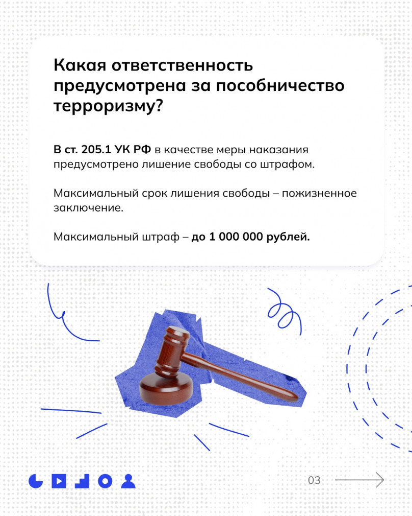 Терроризм – тяжкое преступление, представляющее угрозу безопасности общества и государства. Законодательство РФ предусматривает строгую ответственность не только за непосредственное участие в террористической деятельности, но и за любое пособничество ей. Даже косвенная поддержка террористов может привести к уголовному преследованию.